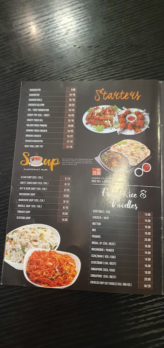 Vegetarians are not left behind either, with options like Green Salad, Vegetable Biriyani, and Vegetable Soup, each providing fresh and hearty ingredients. The Mutton Moghal is a rich, flavorful dish that brings out the deep flavors of the meat, while the Beef Chilli provides a spicy, savory kick.